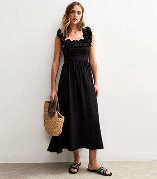 Black Square Neck Ruffled Bow Tie Back Midi Dress