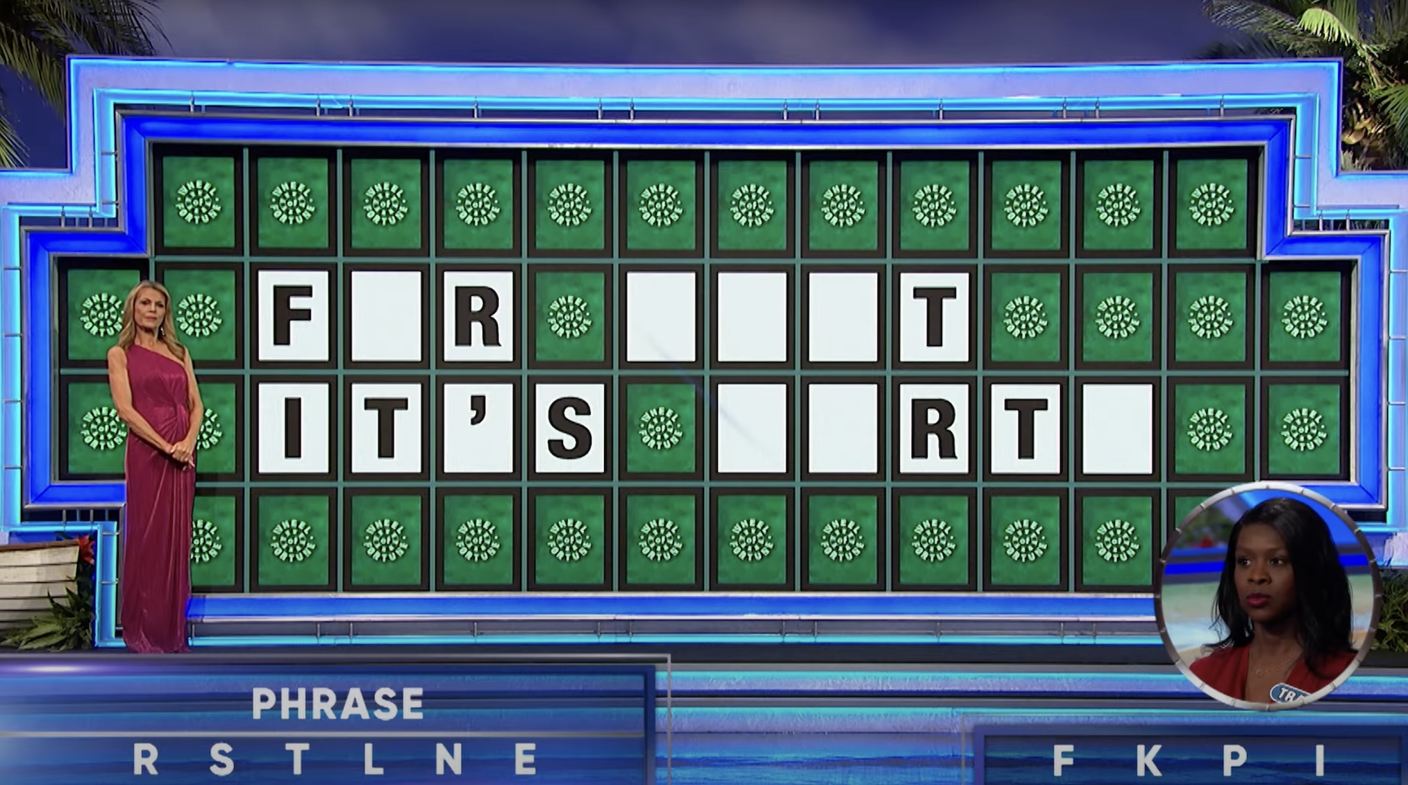 This saw her advance to the Bonus Round, where she selected the dreaded “Phrase” category and the additional letters “F, K, P, and I.”